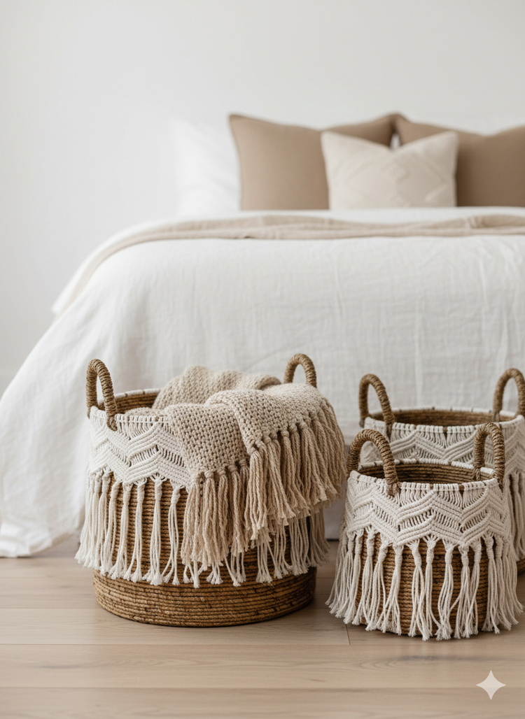 Expertly handcrafted with natural materials, our Basket Laundry Marina adds a touch of boho charm to your home. The macrame design offers a unique, one-of-a-kind look while providing practical storage space for all your laundry needs. Elevate your space with this beautiful and functional piece.