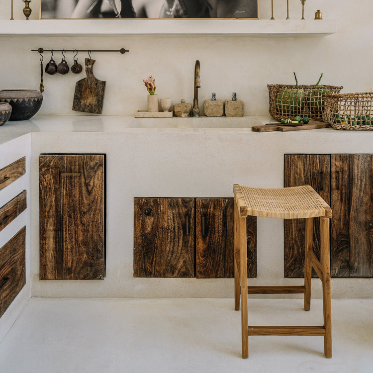 This Stool is made of synthetic handwoven rattan and teak wood.