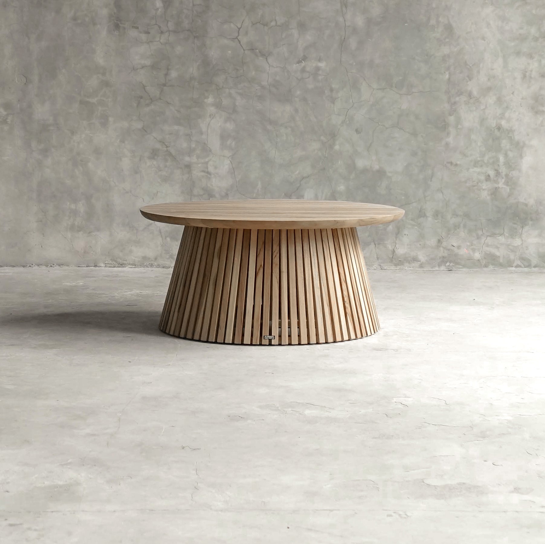 The Elton is defined by its stunning slatted pedestal base, featuring a rhythmic vertical wood design that creates a beautiful play of light and shadow. The oversized circular top provides a generous surface for styling, while the tapered silhouette ensures the piece feels light and airy despite its substantial footprint.
