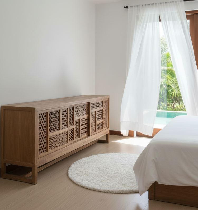 Enhance your entertainment space or bedroom with the Malik TV Dresser, a versatile centerpiece that balances mid-century modern aesthetics with organic warmth. Hand-crafted from premium solid teak wood, this multifunctional unit serves as both a sophisticated media console and a spacious storage dresser, designed to elevate any contemporary interior.