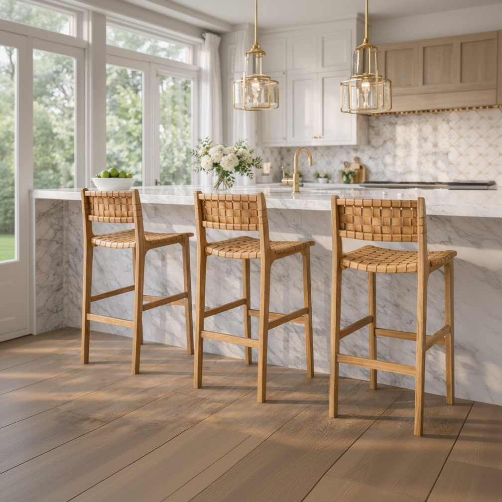 Elevate your home bar or kitchen island with the Michigan Bar Chair, a masterpiece of "Modern Organic" luxury. This stool features a full hand-woven leather seat and back, providing a tactile, high-end finish that only improves with age. The rich texture of the leather weave is perfectly framed by a solid Indonesian teak wood structure, creating a striking balance of natural warmth and contemporary elegance.