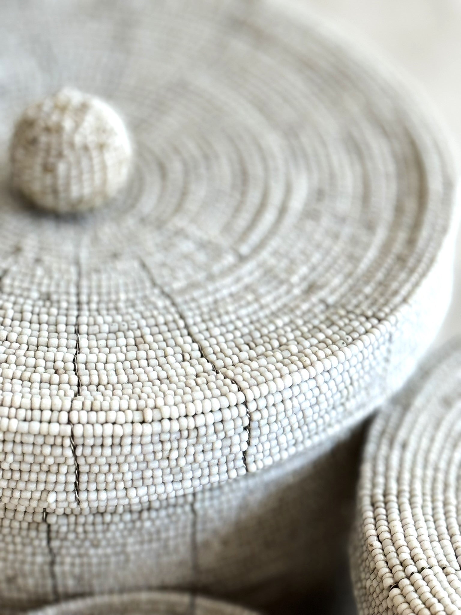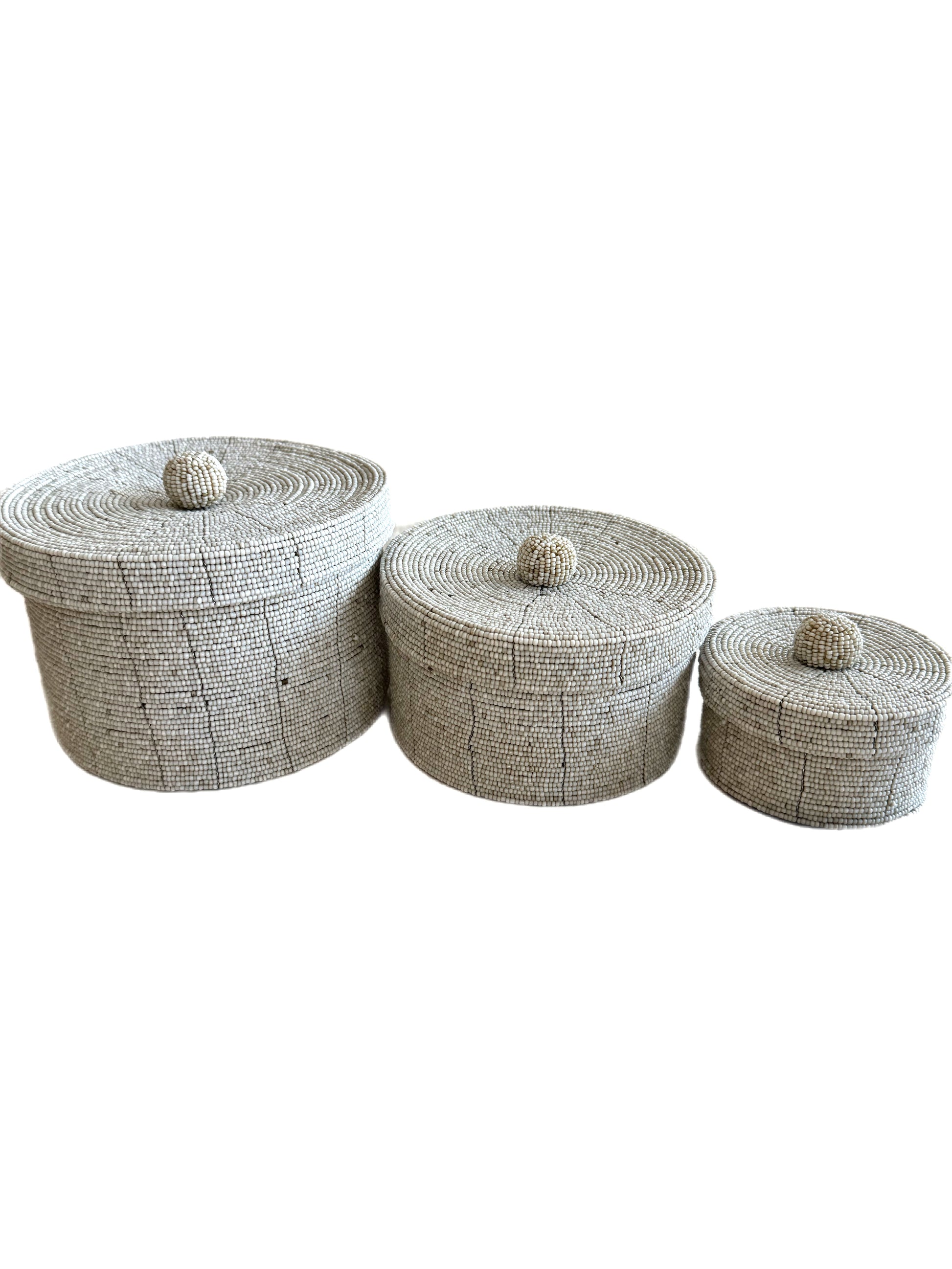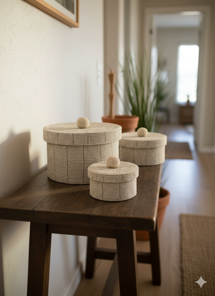 This Mini Basket Eliza Set includes three sizes (small, medium, and large) of beautifully handmade baskets with intricate beat embroidery. Perfect for stylish storage or as unique decor pieces, these baskets provide a touch of elegance to any room. The delicate embroidery is a stunning feature, adding both texture and sophistication to the overall design.