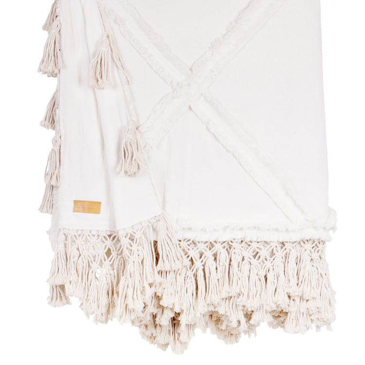 Made of Cotton, this Natural Bali Bohemian Quilt Summer is hand-tufted with macrame tassel edging.