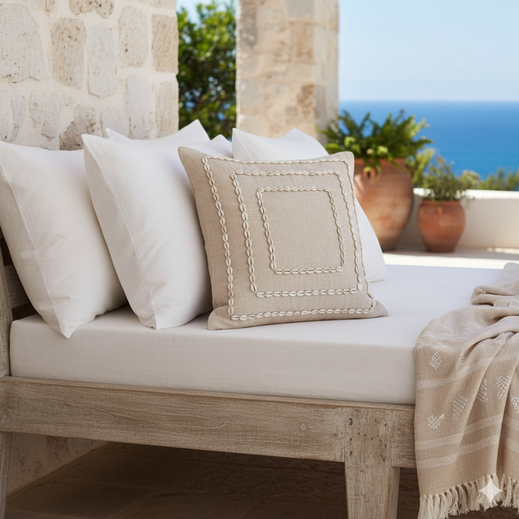 Made from Natural colored linen, this Natural Cowrie Shell Frame cushion with the piping edge is hand stitched framed with shell design.