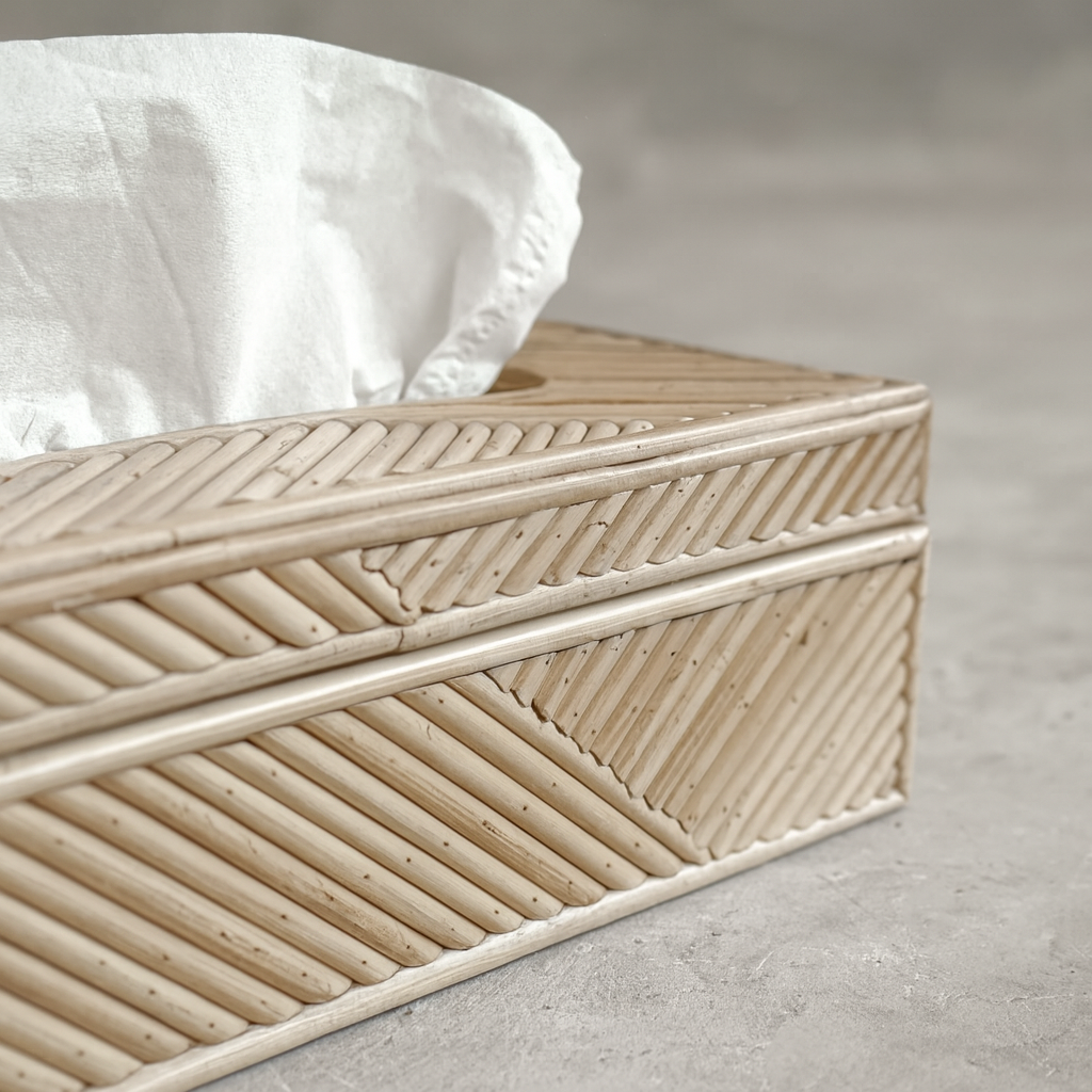 The Zora Tissue Box combines natural elegance with everyday practicality. Handcrafted from finely cut rattan, it showcases clean lines and a precise woven finish that adds warmth and sophistication to any space. Designed to fit standard tissue boxes, Zora transforms a simple necessity into a decorative accent for your home or office.